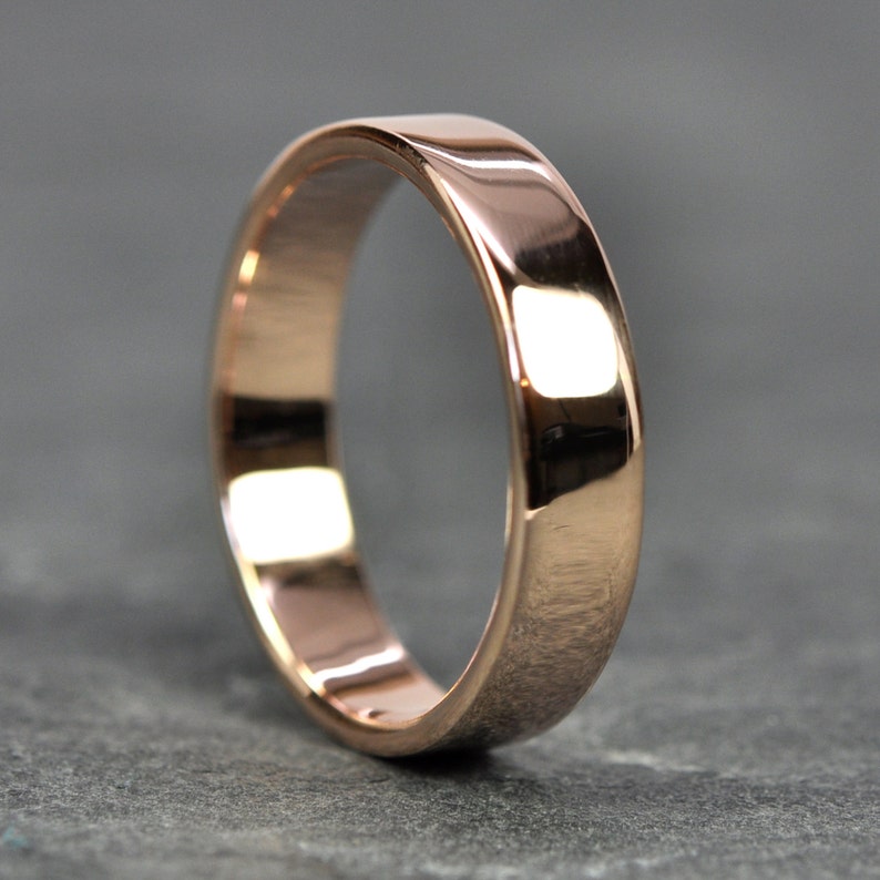 5Mm Rose Gold Wedding Band. Matte modern comfort fit wedding ring. This classic 5mm polished wedding band is rounded at the edges and set in quality 14 karat rose gold. The light overall weight of this style, its classic 5mm width, and low profile aesthetic make it perfect for everyday wear.