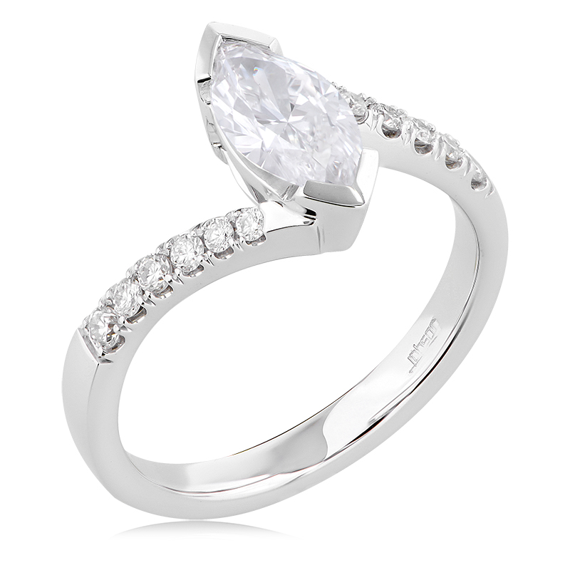 The band swoops gently from one. Available in rose, yellow, or white gold. A marquise diamond engagement ring: The band swoops gently from one.