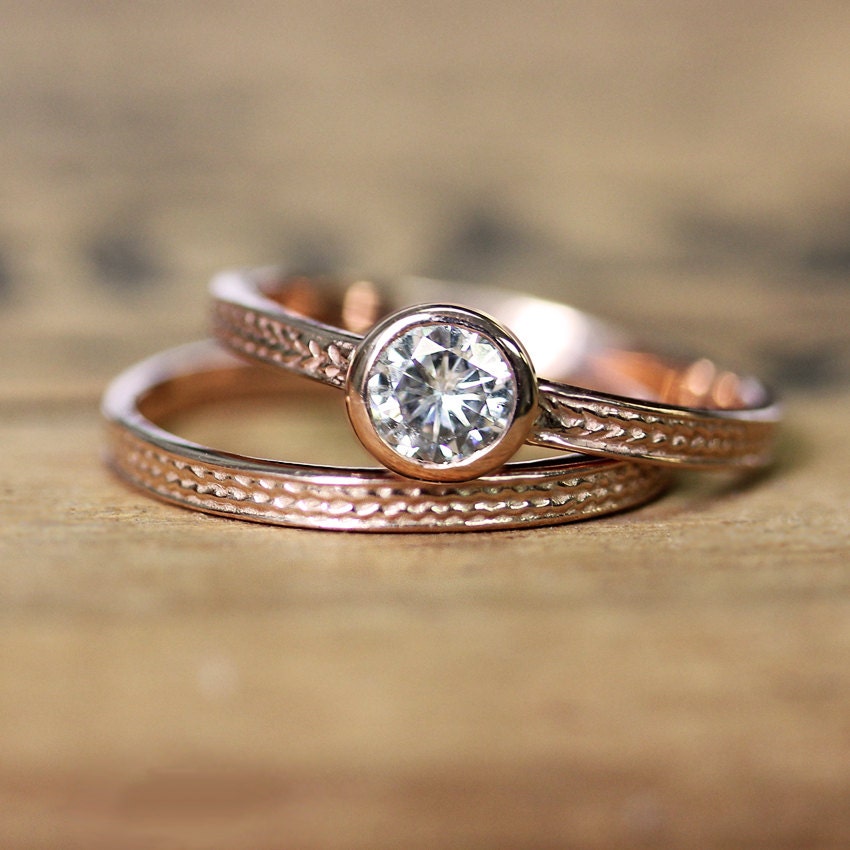 Artfully sculpted bridal ring set of a cushion cut forever one moissanite engagement ring in 14k rose gold vintage floral ring setting pairs gorgeously with a vintage inspired milgrain diamond wedding band for a beautiful effect! Shop for moissanite wedding sets, engagement ring set, wedding bands, wedding rings at esdomera. Wbm0114 ~ moissanite 0.58ct gold wedding band.