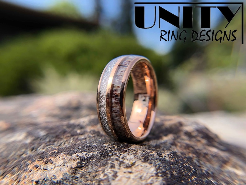 Rose Gold Deer Antler Ring. All 14k gold antler rings come with engraving. These high quality 14k gold antler wedding bands are custom made to order, and absolutely beautiful. Deer antler meteorite tungsten ring, rose gold copper tungsten ring, mens tungsten wedding bands, mens tungsten ring, unityringdesigns.